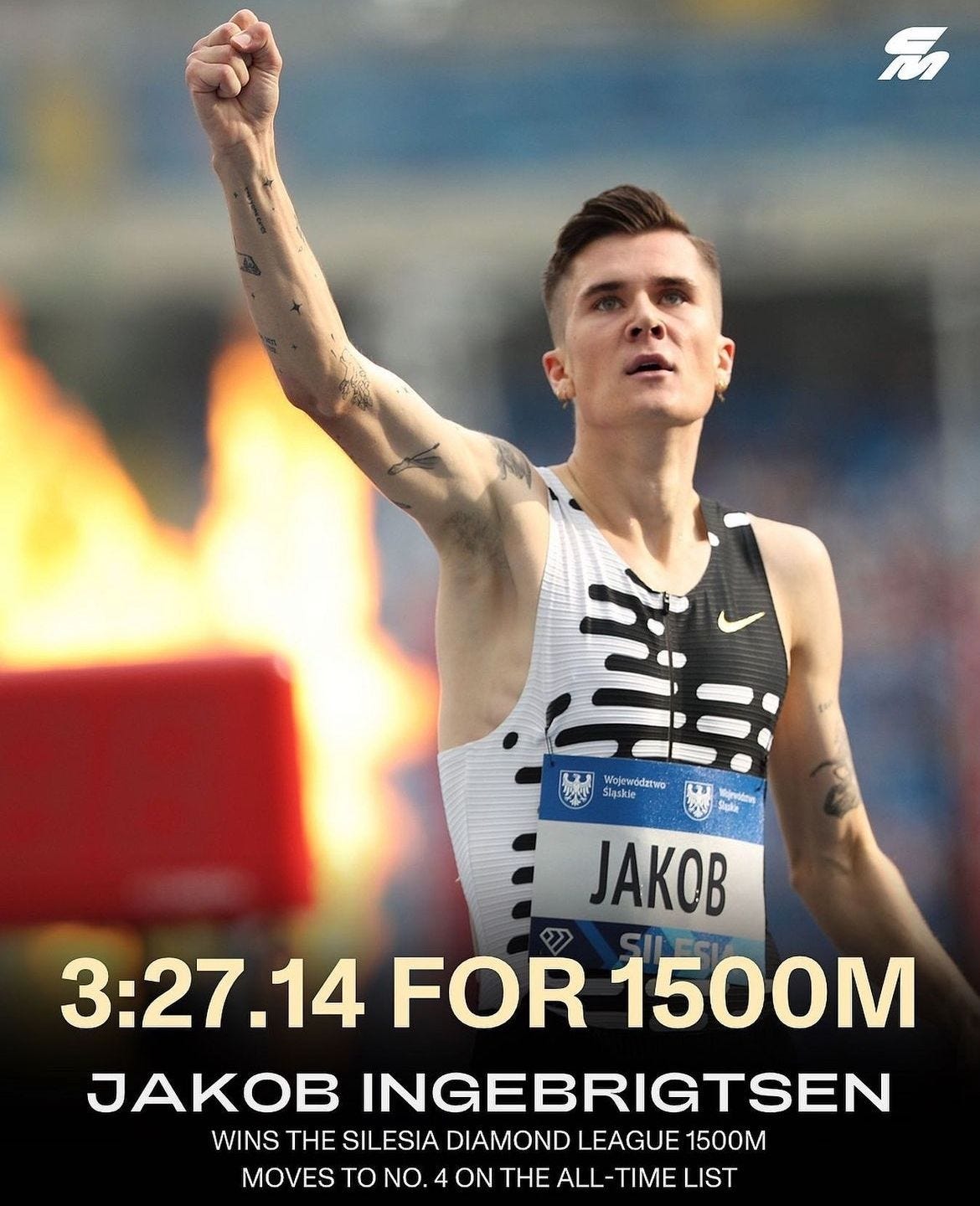 How disappointed are the 1500 guys that opted to run in Monaco rather than Silesia, assuming that they’d be able to ride Jakob “The Fourth Pacemaker” Ingebrigtsen to a new personal best? At least nine men who made the correct-in-hindsight choice to head to Poland owe Jakob a Zywiec after the stunt (running 3:27.14) he pulled, including Andrew Coscoran who set a new Irish national record. (I’m not sure if the 17-year-old Australian Cameron Myers is old enough to buy Jakob a beer, but an OLIPOP will have to do after that 3:33.26.)