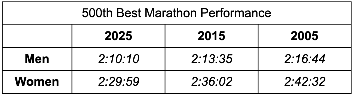 The numbers tell the opposite story. I took a look at the top 500 performances in 2025, 2015, and 2005, on both the men’s and women’s sides, for record-eligible courses. On prestige alone, a 2:42 in 2005 is worth a sub-2:30 today.