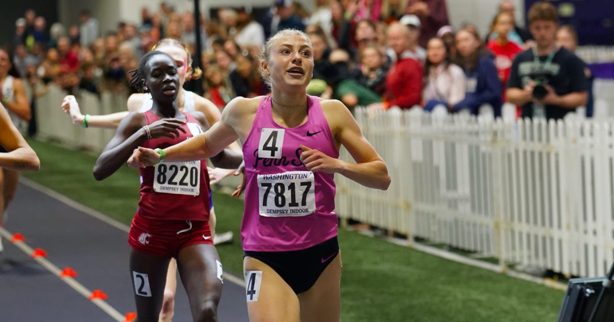 – In oversized short track (medium track?) action, Seattle’s Dempsey Indoor saw four collegians dip under two-minutes in the 800m: Australia’s/Penn State’s Hayley Kitching (1:59.22), Kenya’s/WSU’s Rosemary Longisa (1:59.71), Stanford’s Juliette Whittaker (1:59.76), and UW’s Chloe Foerster (1:59.91).
