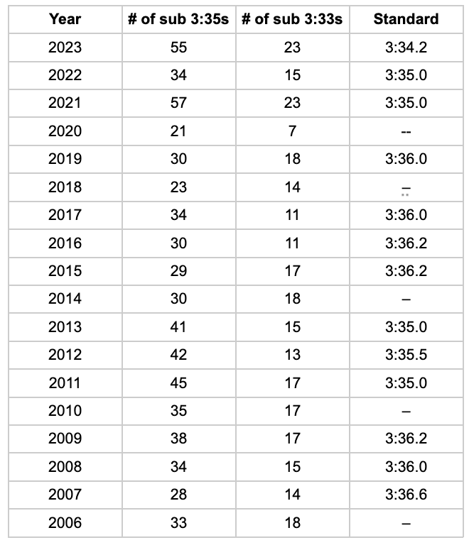 It’s interesting to note that the number of sub-3:33s each year has seen a much smaller range, in comparison to the slightly slower time. The top tier of athletes is apparently not as heavily impacted by the set standard, plus they have a consistent set of opportunities each season. The rich keep getting richer!