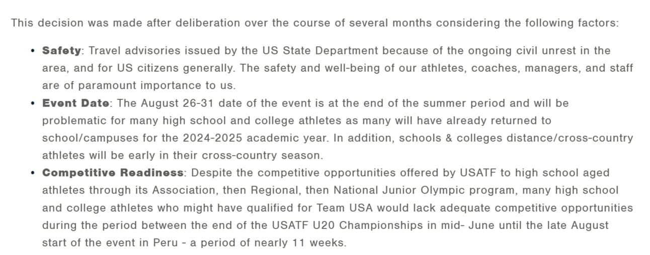 Hey kids, you can forget about seeing the llamas on top of Machu Picchu, because USATF has canceled your field trip to Peru! And by that I mean an opportunity to compete on the world stage, likely for the first time, at the 2024 U20 World Championships this upcoming August 26th - 31st.
