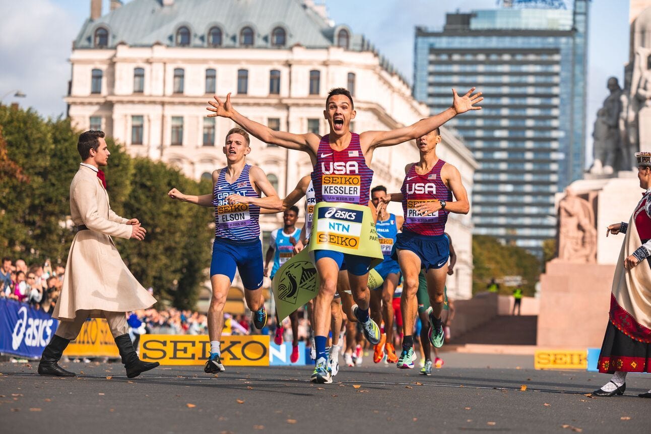 Men’s Mile - There were 35 guys on the line for the mile, but it was not easy for every federation to find the bodies who were eager to continue their track season into October. Most athletes would be running on fumes and fried neuromuscular systems at this point in the year, except for Hobbs Kessler, who has the youthful exuberance necessary to keep things going on pure vibes. That and he was hungry to finish off the year with some hardware. Although the 20-year-old ran significant personal bests of 1:45.80/3:32.61/7:39.00, the one race that mattered most – the US Championships – finished in a disappointing 6th. Still, only in the third “real” season of his career, Kessler is learning to harness his superpower in races. And the $60,000 prize ($10K for the win + $50K for the WR) he took home has many milers wishing they’d have pushed their beach vacation back a couple of weeks.