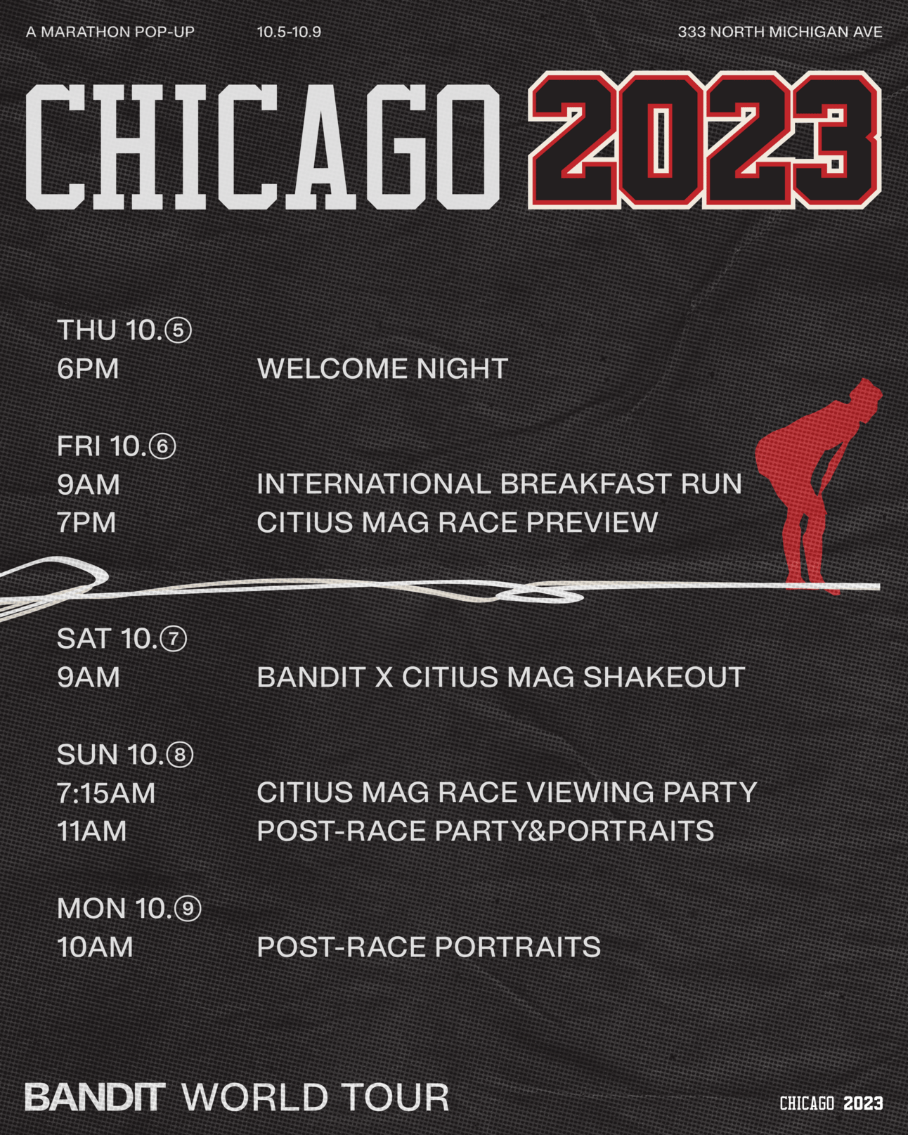 Bandit Running is a performance and lifestyle running apparel brand founded by members of the NYC Running Community in 2020. What started with socks and accessories has grown into a full-fledged apparel line. And this year for the race in Chicago, Bandit is partnering with CITIUS MAG to show up in a major way (I may be biased here, but hey, it’s gonna be sweet). RSVP for their weekend of events here: shake out with your boy on Saturday, and swing by their pop-up at 333 N Michigan Ave starting on Thursday, October 5th.